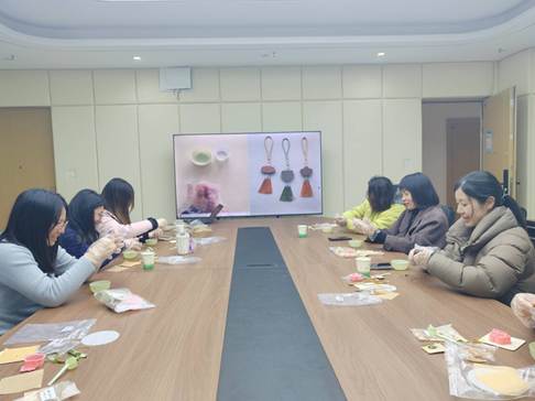 活动现场暖意融融,桌上整齐摆放着香粉、模具、流苏、干花等制作材料。在简单的讲解后,老师们纷纷动手实践,从调配香粉、按压成型到脱模修整、装饰流苏,每一个步骤都细致用心。大家一边制作专属香牌,一边交流生活与工作心得,欢声笑语间,一块块造型精美、香气淡雅的香牌逐渐成型。屏幕上的制作教程与老师们专注创作的身影相映成趣,现场处处洋溢着轻松愉悦的氛围。