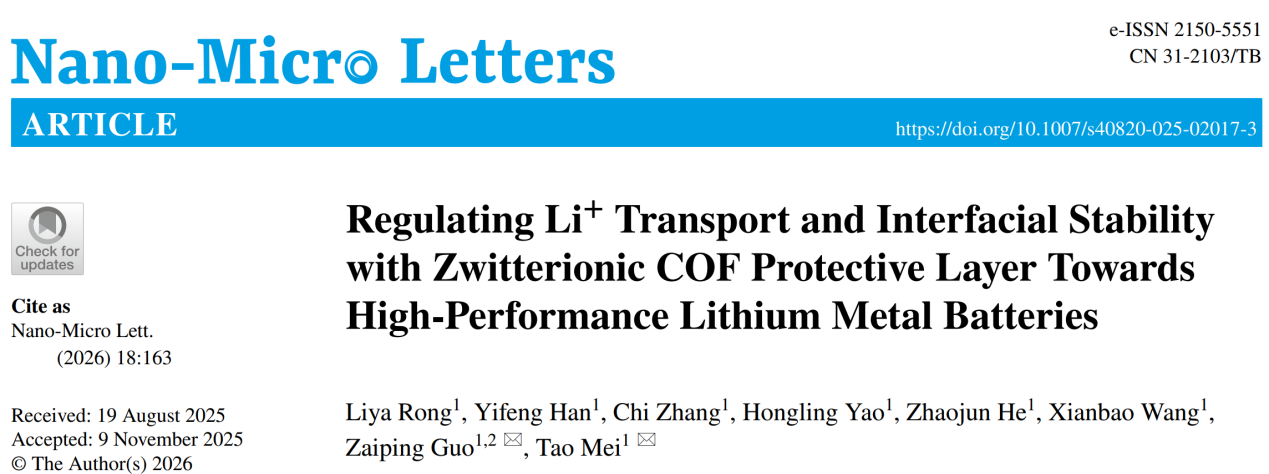 近日,yl8cc永利线路检测中心yl8cc永利线路检测中心梅涛教授团队在国际顶级期刊《Nano-Micro Letters》(IF=36.3‌,在JCR纳米科技、材料科学和物理应用三个学科均位列Q1区前5%,其中纳米科技排名全球第2‌‌)发表题为《Regulating Li+ Transport and Interfacial Stability with Zwitterionic COF Protective Layer Towards High-Performance Lithium Metal Batteries》的研究成果。yl8cc永利线路检测中心为第一单位,2023级博士研究生戎丽雅为论文第一作者,香港城市大学郭再萍院士、yl8cc永利线路检测中心梅涛教授为共同通讯作者。